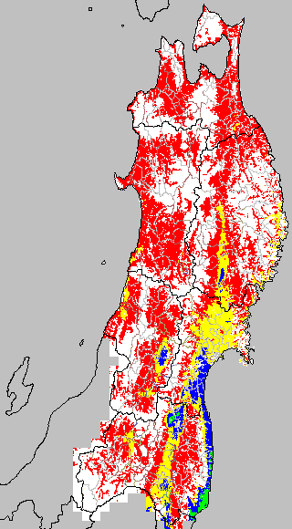 各種文献などを参考にして、草丈・根の伸長に関する限界温度を平均気温で13℃と設定し、13℃以上については1℃刻みで表示します。過去7日の移動平均値で示す。草丈や根の伸長が遅延すると予想される地域を監視するものです。