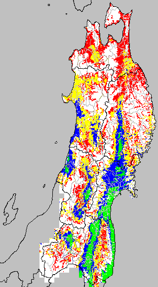 各種文献などを参考にして、草丈・根の伸長に関する限界温度を平均気温で13℃と設定し、13℃以上については1℃刻みで表示します。過去7日の移動平均値で示す。草丈や根の伸長が遅延すると予想される地域を監視するものです。
