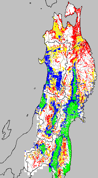 各種文献などを参考にして、草丈・根の伸長に関する限界温度を平均気温で13℃と設定し、13℃以上については1℃刻みで表示します。過去7日の移動平均値で示す。草丈や根の伸長が遅延すると予想される地域を監視するものです。