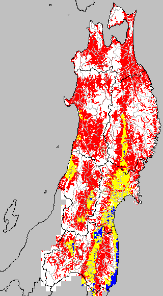 各種文献などを参考にして、分げつ形成に関する限界温度を平均気温で15℃と設定し、15℃以上については1℃刻みで表示します。過去7日の移動平均値で示す。分げつの形成が遅延すると予想される地域を監視するものです。