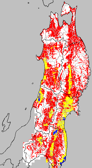 各種文献などを参考にして、分げつ形成に関する限界温度を平均気温で15℃と設定し、15℃以上については1℃刻みで表示します。過去7日の移動平均値で示す。分げつの形成が遅延すると予想される地域を監視するものです。