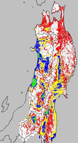 各種文献などを参考にして、分げつ形成に関する限界温度を平均気温で15℃と設定し、15℃以上については1℃刻みで表示します。過去7日の移動平均値で示す。分げつの形成が遅延すると予想される地域を監視するものです。