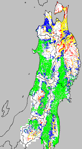 各種文献などを参考にして、草丈・根の伸長に関する限界温度を平均気温で13℃と設定し、13℃以上については1℃刻みで表示します。過去7日の移動平均値で示す。草丈や根の伸長が遅延すると予想される地域を監視するものです。