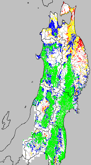 各種文献などを参考にして、草丈・根の伸長に関する限界温度を平均気温で13℃と設定し、13℃以上については1℃刻みで表示します。過去7日の移動平均値で示す。草丈や根の伸長が遅延すると予想される地域を監視するものです。
