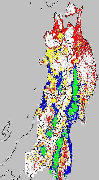 各種文献などを参考にして、分げつ形成に関する限界温度を平均気温で15℃と設定し、15℃以上については1℃刻みで表示します。過去7日の移動平均値で示す。分げつの形成が遅延すると予想される地域を監視するものです。