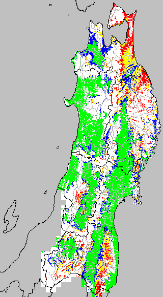 各種文献などを参考にして、分げつ形成に関する限界温度を平均気温で15℃と設定し、15℃以上については1℃刻みで表示します。過去7日の移動平均値で示す。分げつの形成が遅延すると予想される地域を監視するものです。