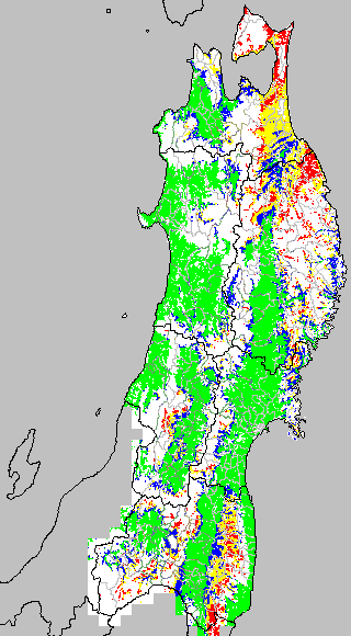 各種文献などを参考にして、分げつ形成に関する限界温度を平均気温で15℃と設定し、15℃以上については1℃刻みで表示します。過去7日の移動平均値で示す。分げつの形成が遅延すると予想される地域を監視するものです。