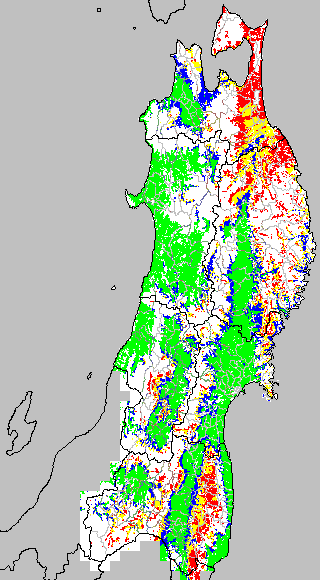 各種文献などを参考にして、分げつ形成に関する限界温度を平均気温で15℃と設定し、15℃以上については1℃刻みで表示します。過去7日の移動平均値で示す。分げつの形成が遅延すると予想される地域を監視するものです。