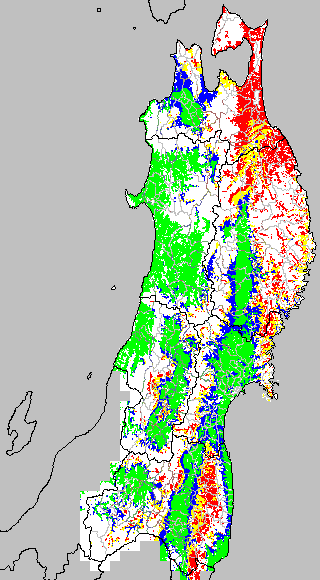 各種文献などを参考にして、分げつ形成に関する限界温度を平均気温で15℃と設定し、15℃以上については1℃刻みで表示します。過去7日の移動平均値で示す。分げつの形成が遅延すると予想される地域を監視するものです。