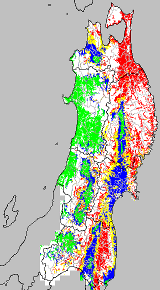 各種文献などを参考にして、分げつ形成に関する限界温度を平均気温で15℃と設定し、15℃以上については1℃刻みで表示します。過去7日の移動平均値で示す。分げつの形成が遅延すると予想される地域を監視するものです。