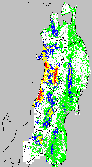 安全作期の策定にある気温指標のうち、いもち病蔓延可能日の平均気温指標20.0℃を用いて表示し、20.0℃未満については1℃刻みで表示します。過去7日の移動平均値で示しています。いもち病の蔓延可能域を監視するものです。葉いもち発生予察メッシュと併せてご覧ください。