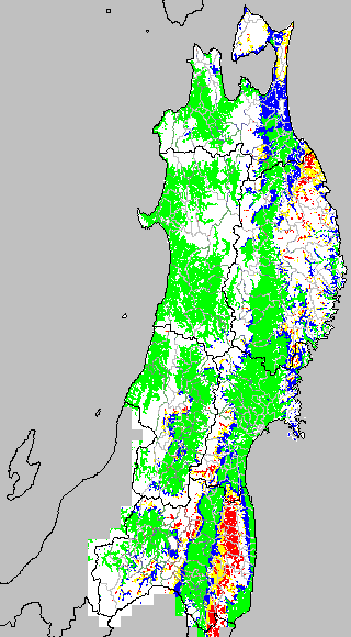 各種文献などを参考にして、分げつ形成に関する限界温度を平均気温で15℃と設定し、15℃以上については1℃刻みで表示します。過去7日の移動平均値で示す。分げつの形成が遅延すると予想される地域を監視するものです。