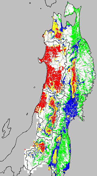 安全作期の策定にある気温指標のうち、いもち病蔓延可能日の平均気温指標20.0℃を用いて表示し、20.0℃未満については1℃刻みで表示します。過去7日の移動平均値で示しています。いもち病の蔓延可能域を監視するものです。葉いもち発生予察メッシュと併せてご覧ください。