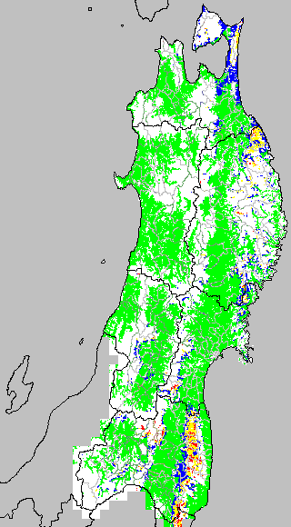 各種文献などを参考にして、分げつ形成に関する限界温度を平均気温で15℃と設定し、15℃以上については1℃刻みで表示します。過去7日の移動平均値で示す。分げつの形成が遅延すると予想される地域を監視するものです。