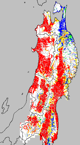 安全作期の策定にある気温指標のうち、いもち病蔓延可能日の平均気温指標20.0℃を用いて表示し、20.0℃未満については1℃刻みで表示します。過去7日の移動平均値で示しています。いもち病の蔓延可能域を監視するものです。葉いもち発生予察メッシュと併せてご覧ください。