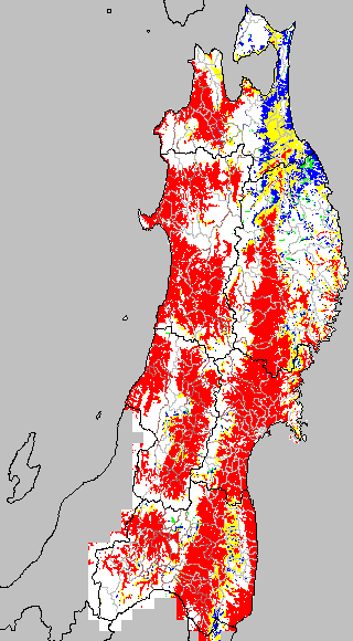 安全作期の策定にある気温指標のうち、いもち病蔓延可能日の平均気温指標20.0℃を用いて表示し、20.0℃未満については1℃刻みで表示します。過去7日の移動平均値で示しています。いもち病の蔓延可能域を監視するものです。葉いもち発生予察メッシュと併せてご覧ください。