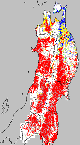 安全作期の策定にある気温指標のうち、いもち病蔓延可能日の平均気温指標20.0℃を用いて表示し、20.0℃未満については1℃刻みで表示します。過去7日の移動平均値で示しています。いもち病の蔓延可能域を監視するものです。葉いもち発生予察メッシュと併せてご覧ください。