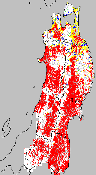 安全作期の策定にある気温指標のうち、いもち病蔓延可能日の平均気温指標20.0℃を用いて表示し、20.0℃未満については1℃刻みで表示します。過去7日の移動平均値で示しています。いもち病の蔓延可能域を監視するものです。葉いもち発生予察メッシュと併せてご覧ください。