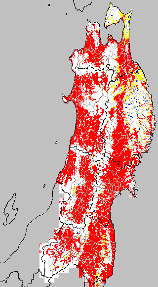 安全作期の策定にある気温指標のうち、いもち病蔓延可能日の平均気温指標20.0℃を用いて表示し、20.0℃未満については1℃刻みで表示します。過去7日の移動平均値で示しています。いもち病の蔓延可能域を監視するものです。葉いもち発生予察メッシュと併せてご覧ください。