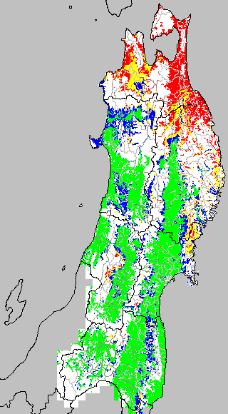 安全作期の策定にある気温指標のうち、乾田直播の安全早限日の気温指標13.5℃を用いて表示しています。13.5℃以下については1℃刻みで表示し、可能域がどのように推移するかをみるものです。