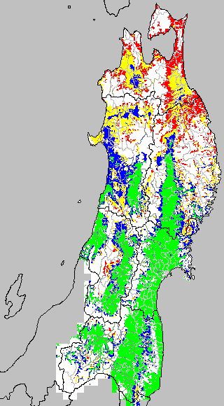 各種文献などを参考にして、草丈・根の伸長に関する限界温度を平均気温で13℃と設定し、13℃以上については1℃刻みで表示します。過去7日の移動平均値で示す。草丈や根の伸長が遅延すると予想される地域を監視するものです。