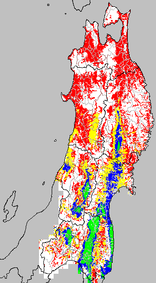 各種文献などを参考にして、分げつ形成に関する限界温度を平均気温で15℃と設定し、15℃以上については1℃刻みで表示します。過去7日の移動平均値で示す。分げつの形成が遅延すると予想される地域を監視するものです。