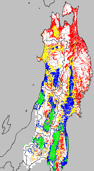 各種文献などを参考にして、分げつ形成に関する限界温度を平均気温で15℃と設定し、15℃以上については1℃刻みで表示します。過去7日の移動平均値で示す。分げつの形成が遅延すると予想される地域を監視するものです。