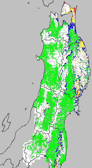 各種文献などを参考にして、草丈・根の伸長に関する限界温度を平均気温で13℃と設定し、13℃以上については1℃刻みで表示します。過去7日の移動平均値で示す。草丈や根の伸長が遅延すると予想される地域を監視するものです。