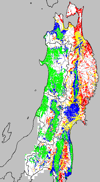 各種文献などを参考にして、分げつ形成に関する限界温度を平均気温で15℃と設定し、15℃以上については1℃刻みで表示します。過去7日の移動平均値で示す。分げつの形成が遅延すると予想される地域を監視するものです。