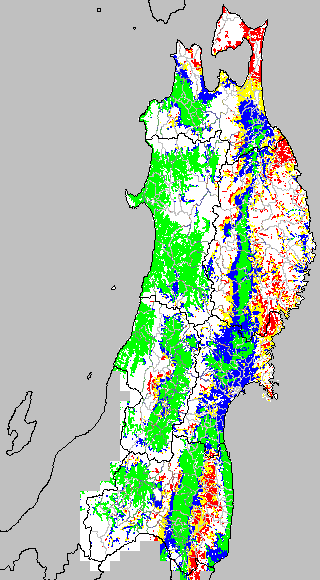 各種文献などを参考にして、分げつ形成に関する限界温度を平均気温で15℃と設定し、15℃以上については1℃刻みで表示します。過去7日の移動平均値で示す。分げつの形成が遅延すると予想される地域を監視するものです。