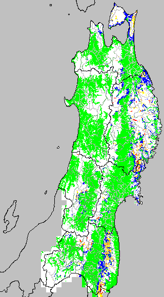 各種文献などを参考にして、草丈・根の伸長に関する限界温度を平均気温で13℃と設定し、13℃以上については1℃刻みで表示します。過去7日の移動平均値で示す。草丈や根の伸長が遅延すると予想される地域を監視するものです。