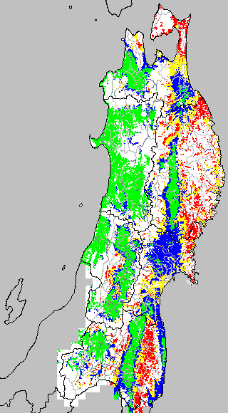 各種文献などを参考にして、分げつ形成に関する限界温度を平均気温で15℃と設定し、15℃以上については1℃刻みで表示します。過去7日の移動平均値で示す。分げつの形成が遅延すると予想される地域を監視するものです。