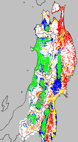 各種文献などを参考にして、分げつ形成に関する限界温度を平均気温で15℃と設定し、15℃以上については1℃刻みで表示します。過去7日の移動平均値で示す。分げつの形成が遅延すると予想される地域を監視するものです。