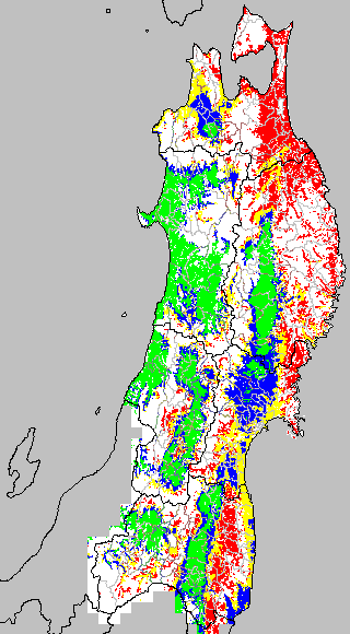 各種文献などを参考にして、分げつ形成に関する限界温度を平均気温で15℃と設定し、15℃以上については1℃刻みで表示します。過去7日の移動平均値で示す。分げつの形成が遅延すると予想される地域を監視するものです。