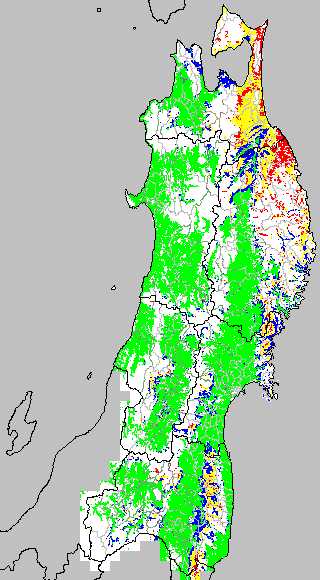 各種文献などを参考にして、草丈・根の伸長に関する限界温度を平均気温で13℃と設定し、13℃以上については1℃刻みで表示します。過去7日の移動平均値で示す。草丈や根の伸長が遅延すると予想される地域を監視するものです。