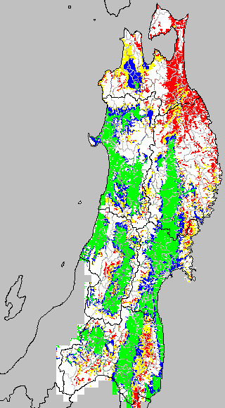 各種文献などを参考にして、分げつ形成に関する限界温度を平均気温で15℃と設定し、15℃以上については1℃刻みで表示します。過去7日の移動平均値で示す。分げつの形成が遅延すると予想される地域を監視するものです。