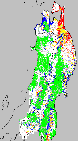 各種文献などを参考にして、分げつ形成に関する限界温度を平均気温で15℃と設定し、15℃以上については1℃刻みで表示します。過去7日の移動平均値で示す。分げつの形成が遅延すると予想される地域を監視するものです。