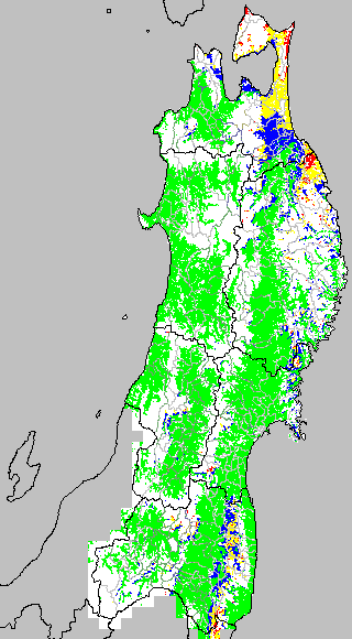 各種文献などを参考にして、分げつ形成に関する限界温度を平均気温で15℃と設定し、15℃以上については1℃刻みで表示します。過去7日の移動平均値で示す。分げつの形成が遅延すると予想される地域を監視するものです。