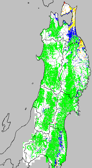 各種文献などを参考にして、分げつ形成に関する限界温度を平均気温で15℃と設定し、15℃以上については1℃刻みで表示します。過去7日の移動平均値で示す。分げつの形成が遅延すると予想される地域を監視するものです。