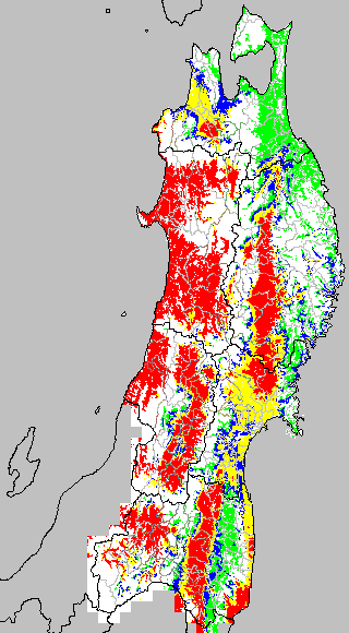 安全作期の策定にある気温指標のうち、いもち病蔓延可能日の平均気温指標20.0℃を用いて表示し、20.0℃未満については1℃刻みで表示します。過去7日の移動平均値で示しています。いもち病の蔓延可能域を監視するものです。葉いもち発生予察メッシュと併せてご覧ください。