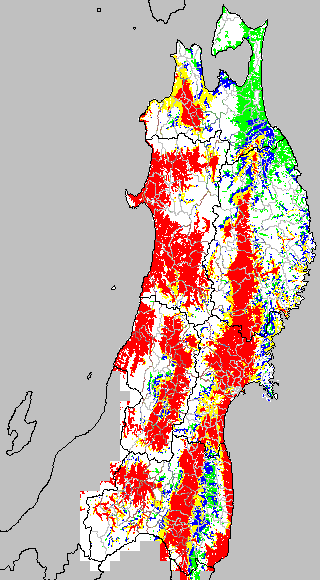安全作期の策定にある気温指標のうち、いもち病蔓延可能日の平均気温指標20.0℃を用いて表示し、20.0℃未満については1℃刻みで表示します。過去7日の移動平均値で示しています。いもち病の蔓延可能域を監視するものです。葉いもち発生予察メッシュと併せてご覧ください。