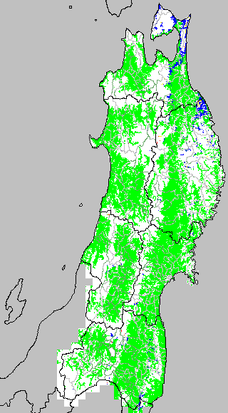 各種文献などを参考にして、分げつ形成に関する限界温度を平均気温で15℃と設定し、15℃以上については1℃刻みで表示します。過去7日の移動平均値で示す。分げつの形成が遅延すると予想される地域を監視するものです。