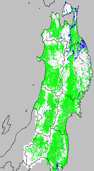 各種文献などを参考にして、分げつ形成に関する限界温度を平均気温で15℃と設定し、15℃以上については1℃刻みで表示します。過去7日の移動平均値で示す。分げつの形成が遅延すると予想される地域を監視するものです。