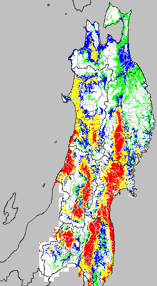 安全作期の策定にある気温指標のうち、いもち病蔓延可能日の平均気温指標20.0℃を用いて表示し、20.0℃未満については1℃刻みで表示します。過去7日の移動平均値で示しています。いもち病の蔓延可能域を監視するものです。葉いもち発生予察メッシュと併せてご覧ください。
