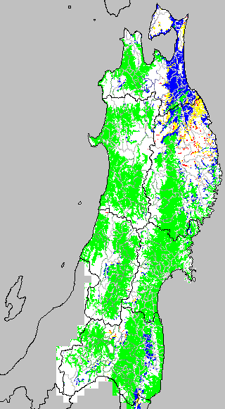 各種文献などを参考にして、分げつ形成に関する限界温度を平均気温で15℃と設定し、15℃以上については1℃刻みで表示します。過去7日の移動平均値で示す。分げつの形成が遅延すると予想される地域を監視するものです。
