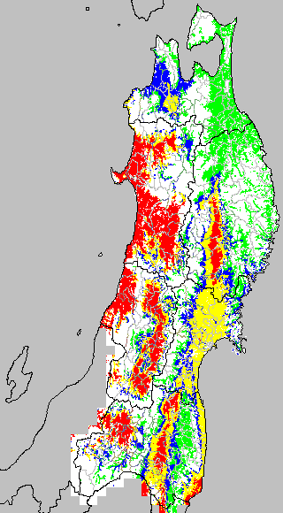 安全作期の策定にある気温指標のうち、いもち病蔓延可能日の平均気温指標20.0℃を用いて表示し、20.0℃未満については1℃刻みで表示します。過去7日の移動平均値で示しています。いもち病の蔓延可能域を監視するものです。葉いもち発生予察メッシュと併せてご覧ください。