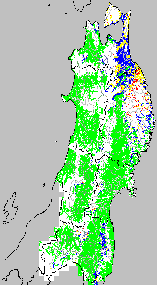 各種文献などを参考にして、分げつ形成に関する限界温度を平均気温で15℃と設定し、15℃以上については1℃刻みで表示します。過去7日の移動平均値で示す。分げつの形成が遅延すると予想される地域を監視するものです。