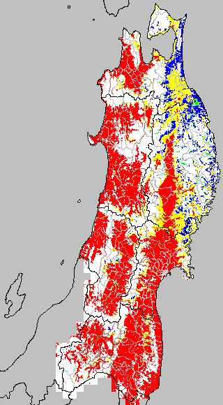 安全作期の策定にある気温指標のうち、いもち病蔓延可能日の平均気温指標20.0℃を用いて表示し、20.0℃未満については1℃刻みで表示します。過去7日の移動平均値で示しています。いもち病の蔓延可能域を監視するものです。葉いもち発生予察メッシュと併せてご覧ください。