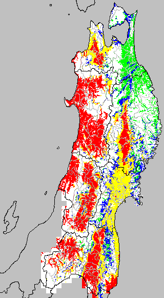 安全作期の策定にある気温指標のうち、いもち病蔓延可能日の平均気温指標20.0℃を用いて表示し、20.0℃未満については1℃刻みで表示します。過去7日の移動平均値で示しています。いもち病の蔓延可能域を監視するものです。葉いもち発生予察メッシュと併せてご覧ください。