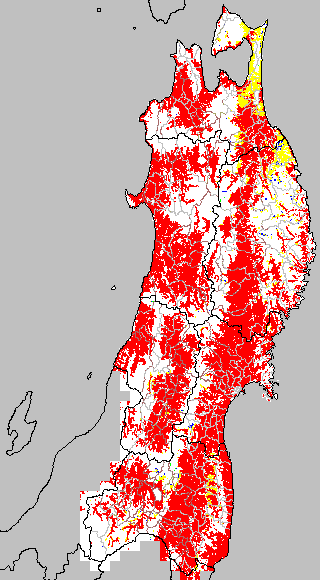 安全作期の策定にある気温指標のうち、いもち病蔓延可能日の平均気温指標20.0℃を用いて表示し、20.0℃未満については1℃刻みで表示します。過去7日の移動平均値で示しています。いもち病の蔓延可能域を監視するものです。葉いもち発生予察メッシュと併せてご覧ください。